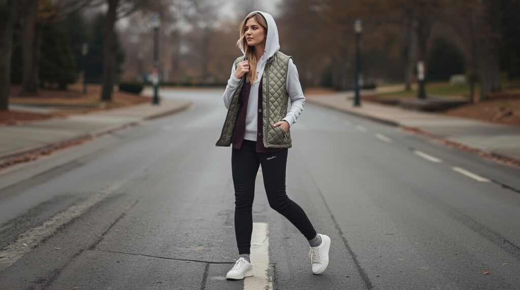 A quilted vest layered over a hoodie keeps you warm without restricting movement. Pair with joggers for a relaxed yet stylish fit.