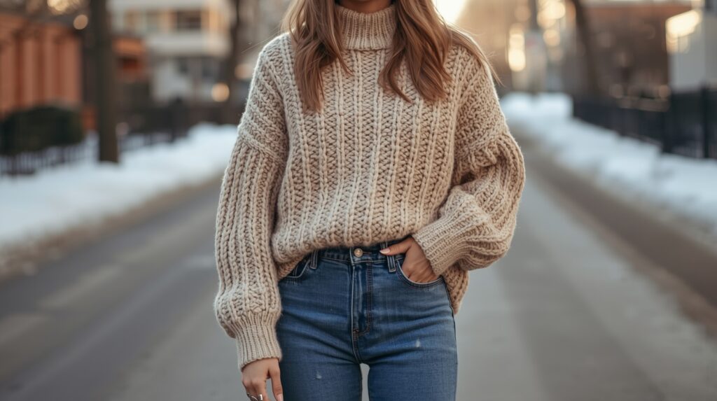 Chunky knit sweaters paired with high-waisted jeans create the perfect blend of comfort and style. Choose neutral tones like beige, cream, or gray for an elegant winter vibe.