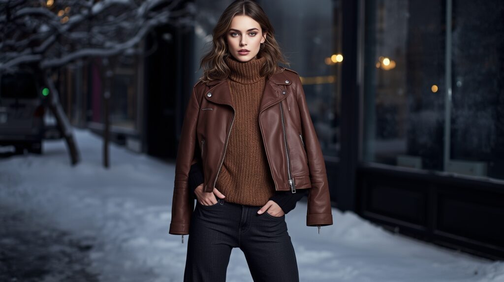 For an edgy winter vibe, style a classic leather jacket with a warm knit sweater and boots.