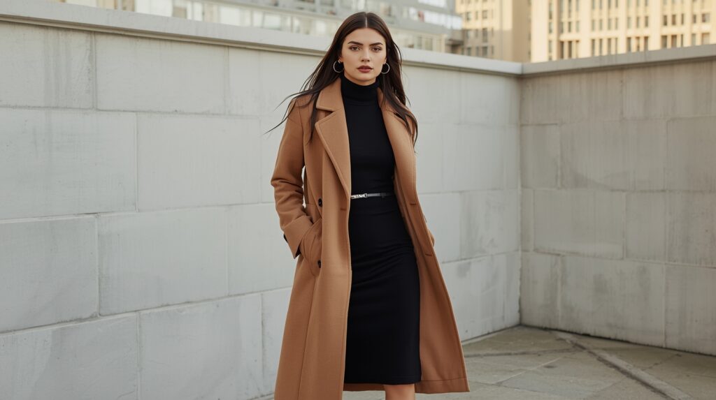 A long wool coat layered over a fitted turtleneck dress gives a sophisticated silhouette that keeps you warm.